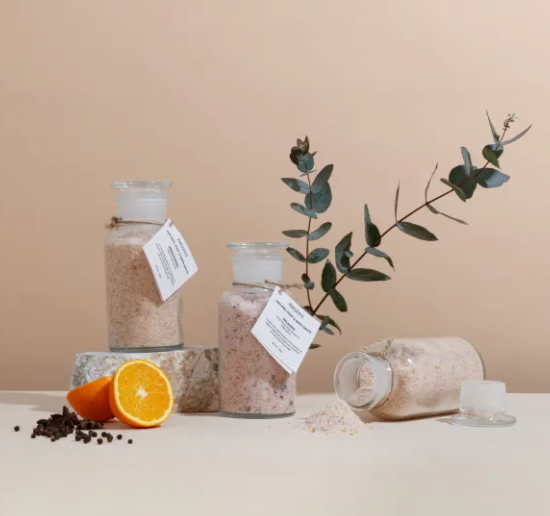 Made with: A blend of Himalayan and Epsom salts infused with essential oils and dried botanicals presented in clear reusable reagent bottle.
